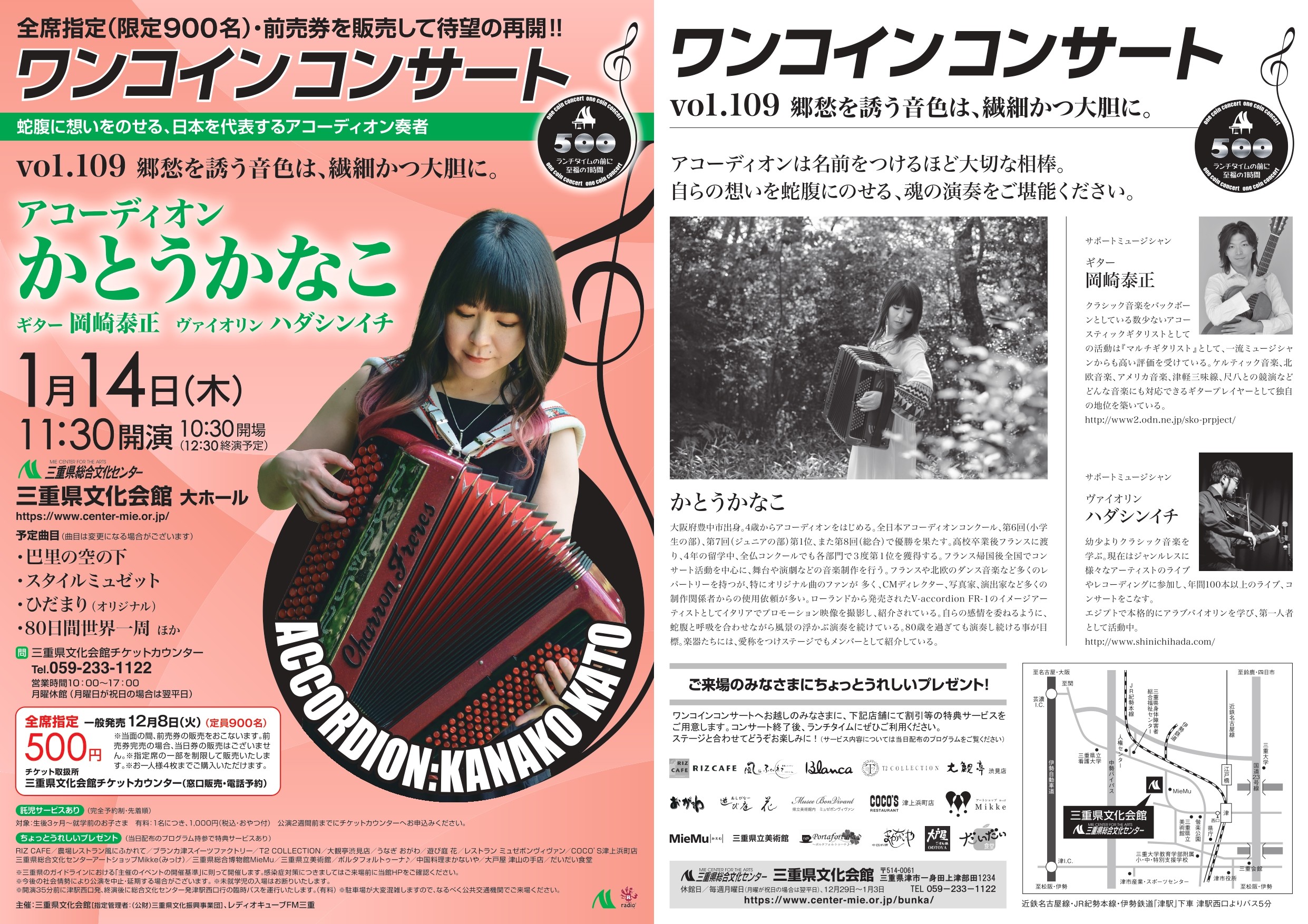 | 01/14 | 三重 三重県文化会館大ホール「ワンコインコンサートvol.109」公演中止●かとうかなこ、岡崎泰正(ギター)、秦 進一(ヴァイオリン)FLYER |