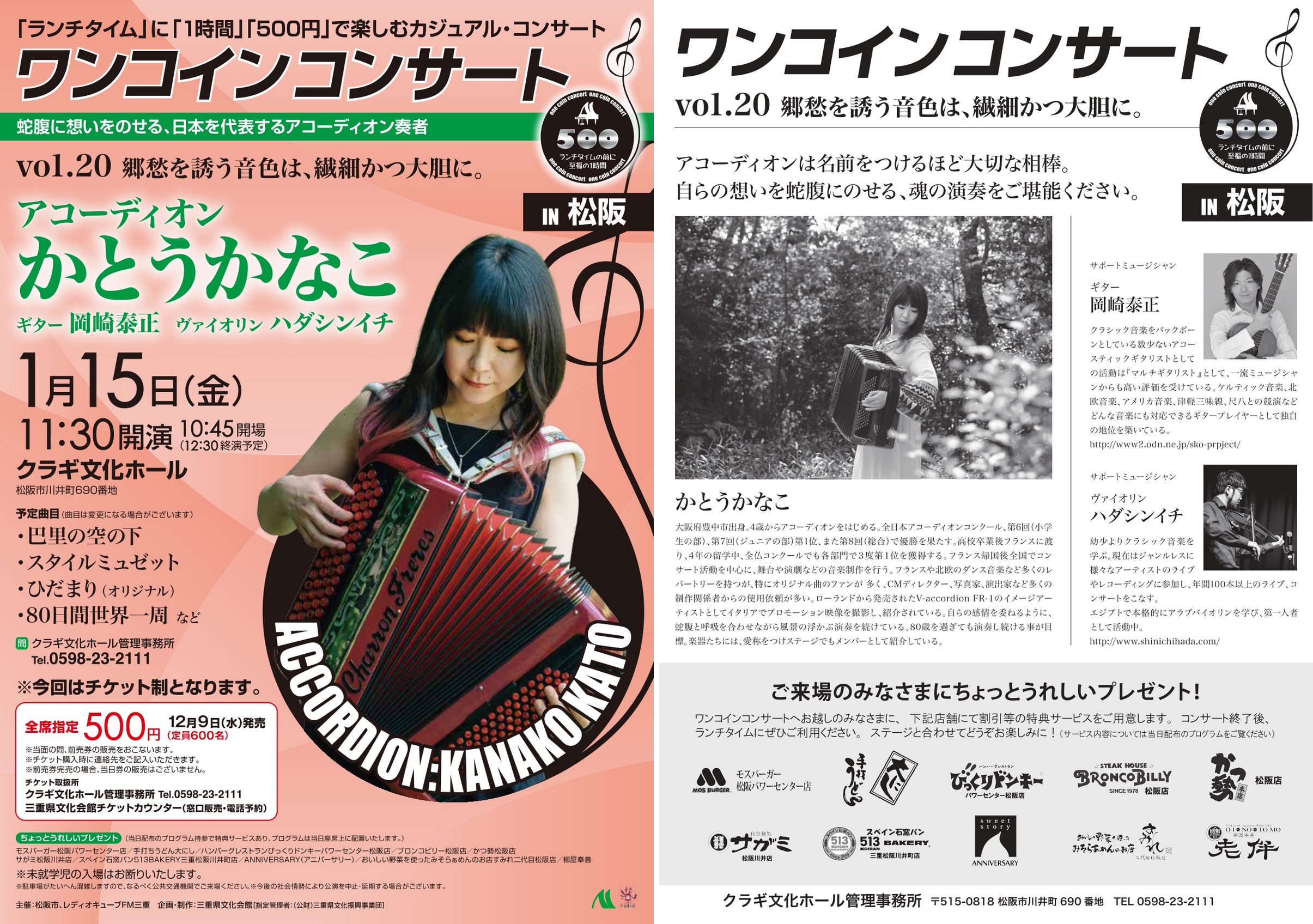 | 01/15 | 三重 クラギ文化ホール「ワンコインコンサートvol.20」公演中止●かとうかなこ、岡崎泰正、秦 進一FLYER |