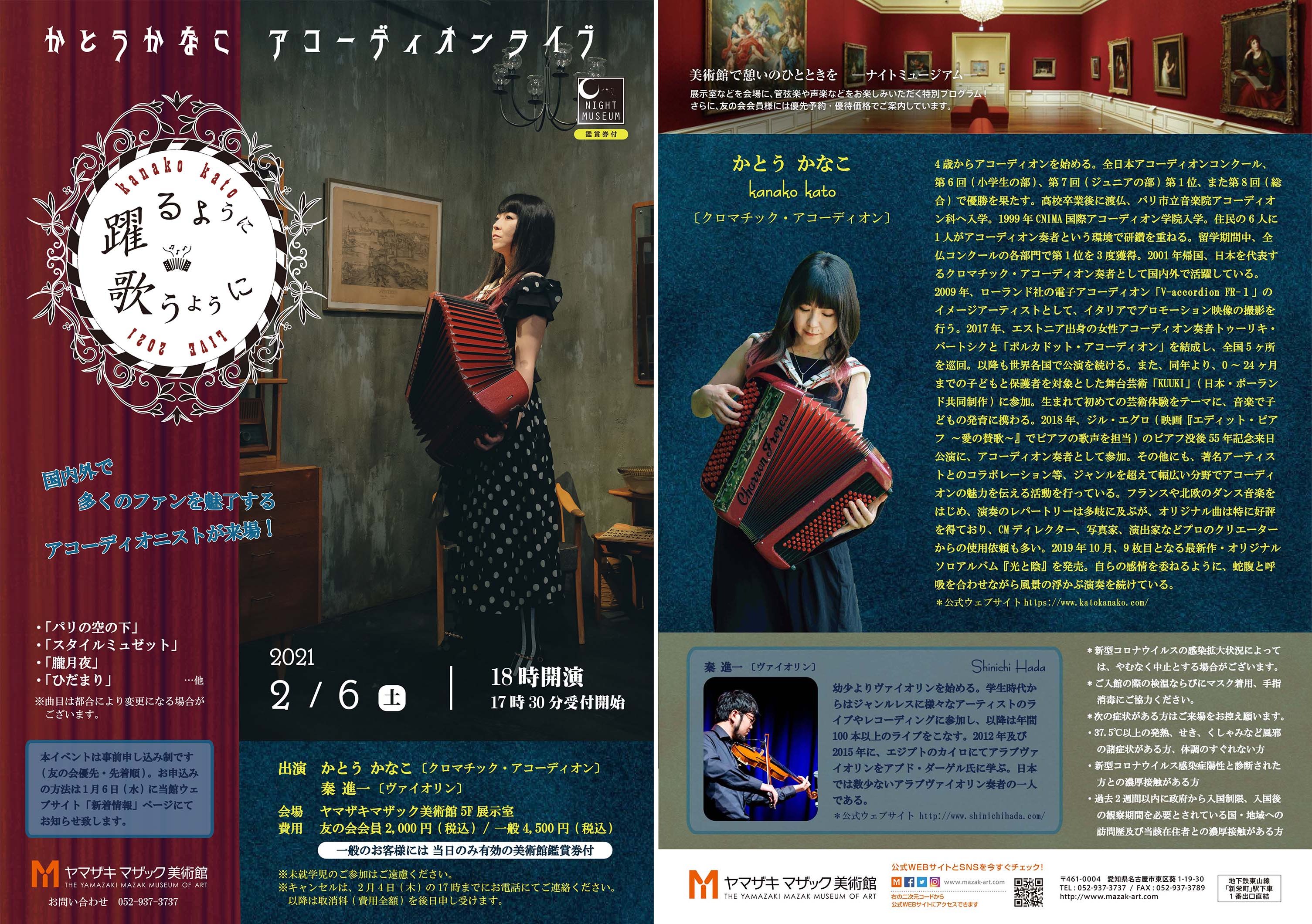 | 02/06 | 愛知 ヤマザキ マザック美術館「踊るように歌うように~かとうかなこ アコーディオンライブ~」●かとうかなこ、秦 進一FLYER |