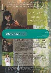 | 06/27 | 富山 城東音楽院ホール飛翔「かとうかなこ Solo plus ~やわらかな光~」●かとうかなこ、[ゲスト]西田宏美(クラリネット)FLYER |