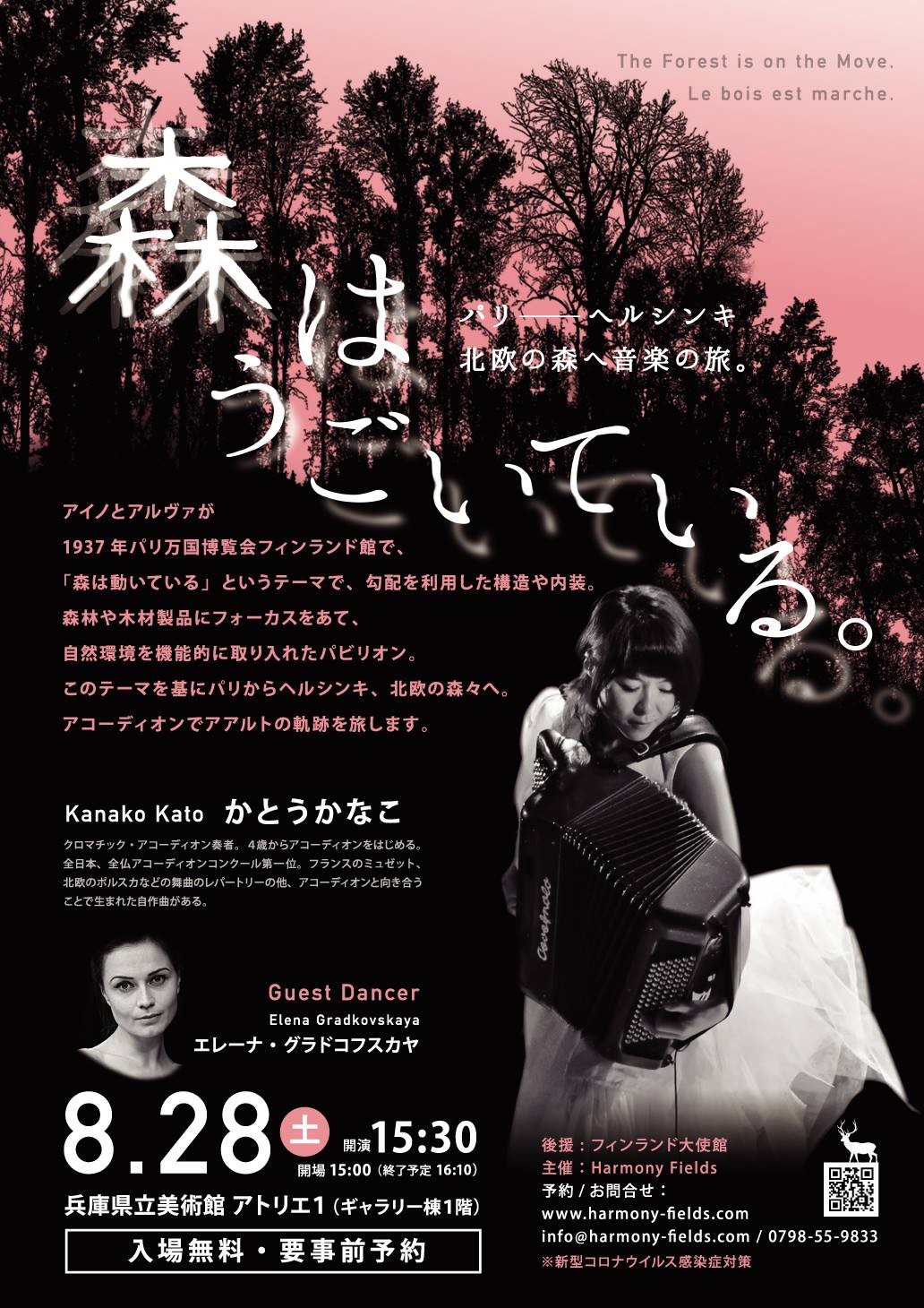 | 08/28 | 兵庫 兵庫県立美術館 アトリエ1「森は動いている。パリ-ヘルシンキ 北欧の森へ音楽の旅」●かとうかなこ、[ゲスト]エレーナ・グラドコフスカ(ダンス)FLYER |