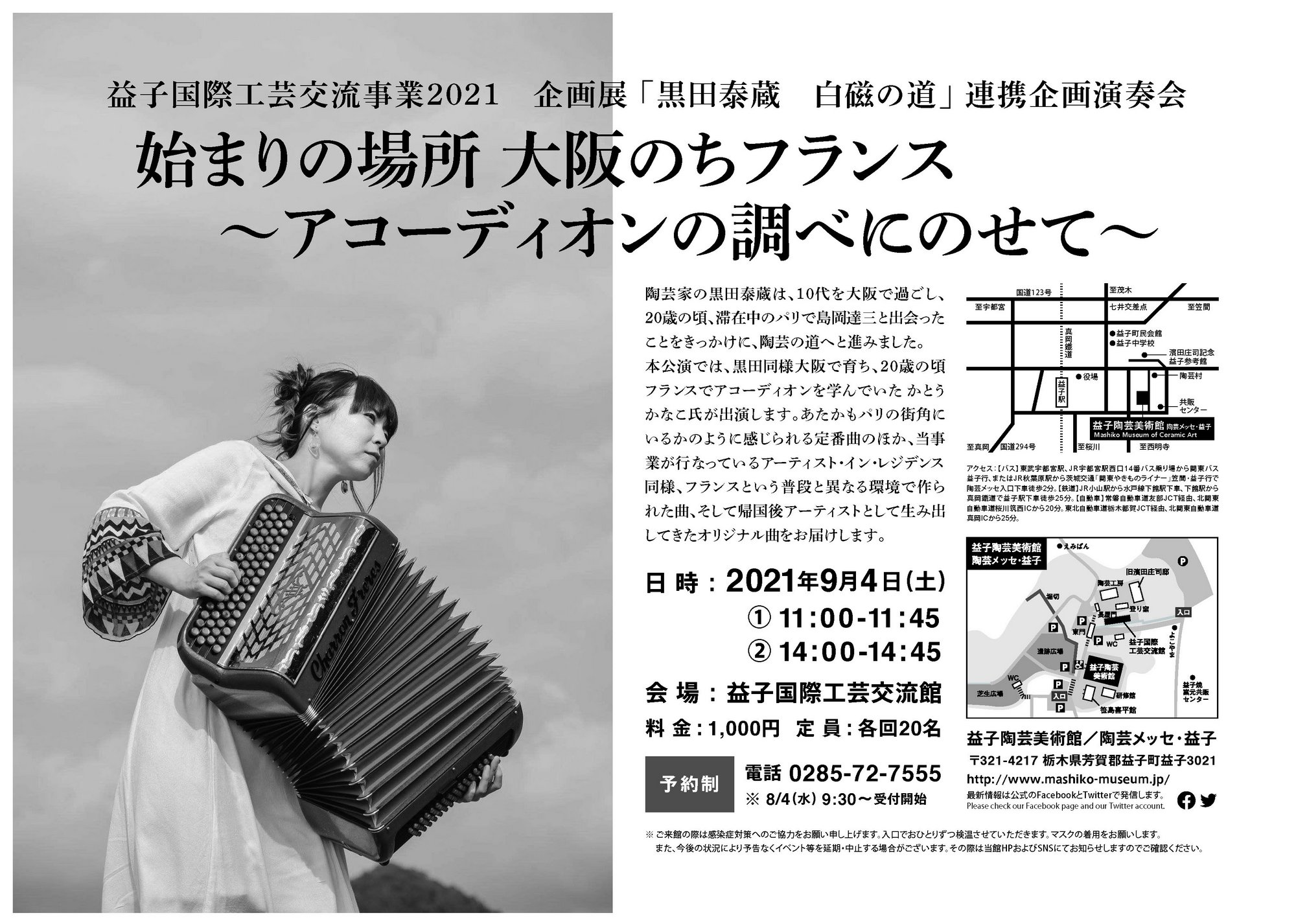 | 10/02 | 栃木 益子国際工芸交流館「始まりの場所 大阪のちフランス~アコーディオンの調べにのせて」●かとうかなこFLYER |