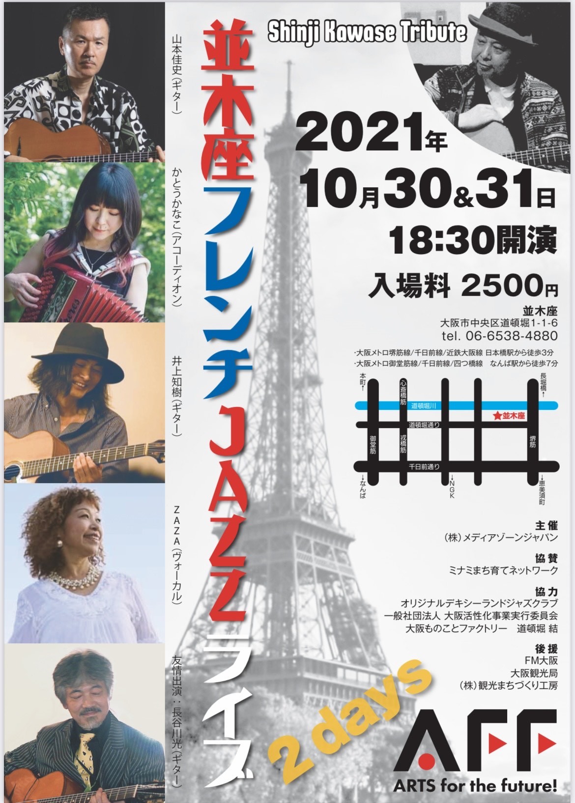 | 10/30 | 道頓堀ミュージアム並木座「並木座フレンチJAZZライブ 2days」●山本佳史(ギター)、かとうかなこ(アコーディオン)、井上知樹(ギター)、ZARA(ヴォーカル)、[友情出演]長谷川光(ギター)FLYER |