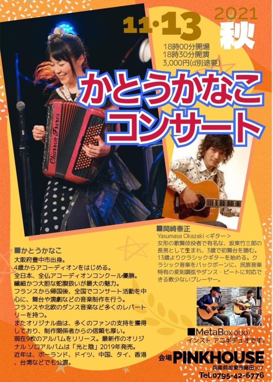| 11/13 | 兵庫 PINKHOUSE「かとうかなこコンサート」●かとうかなこ、岡崎泰正、MetaBox(duo)FLYER |