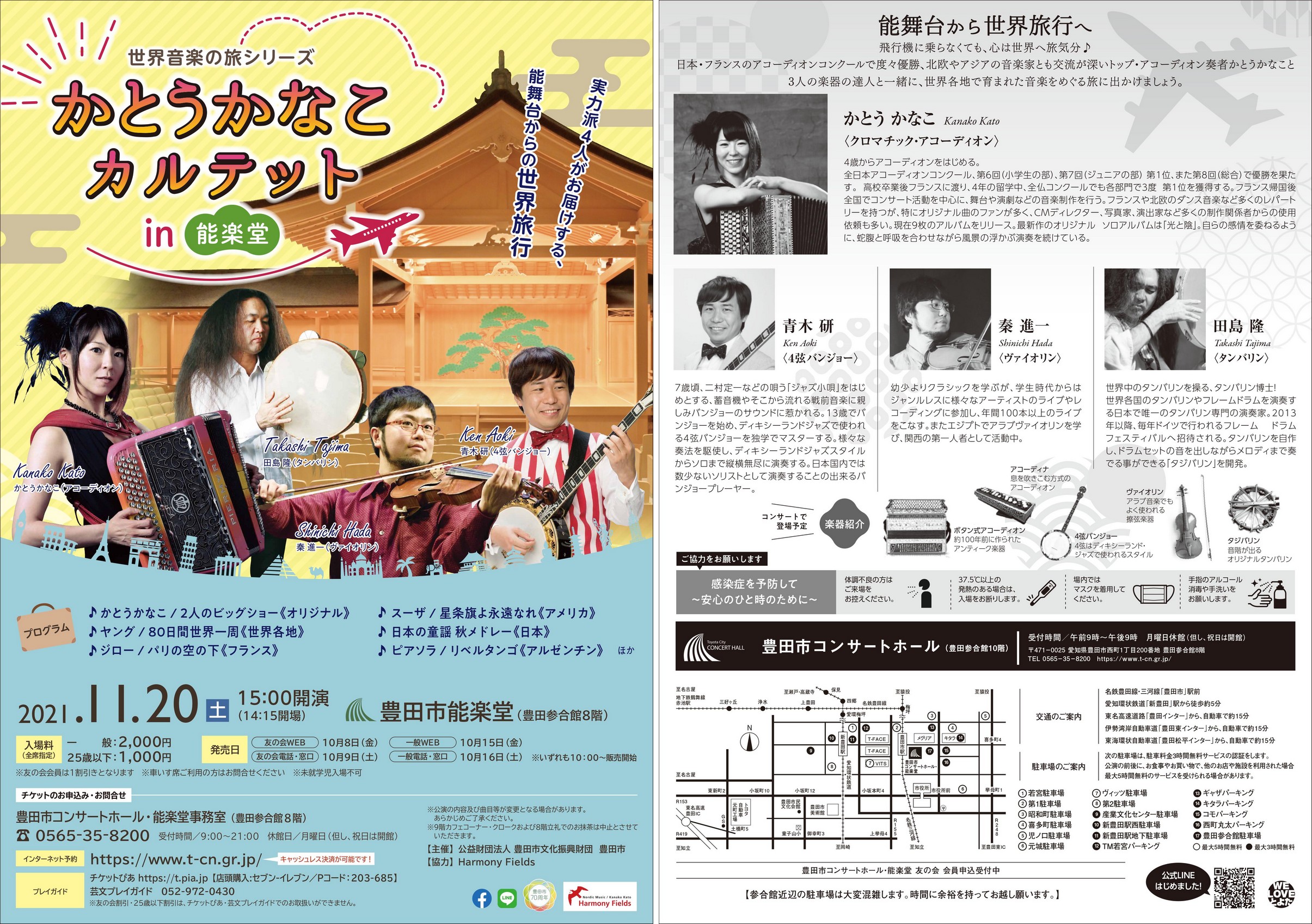 | 11/20 | 愛知 豊田市能楽堂「世界音楽の旅シリーズ~かとうかなこカルテット」●かとうかなこ、田島隆、青木 研(バンジョー)、秦 進一FLYER |
