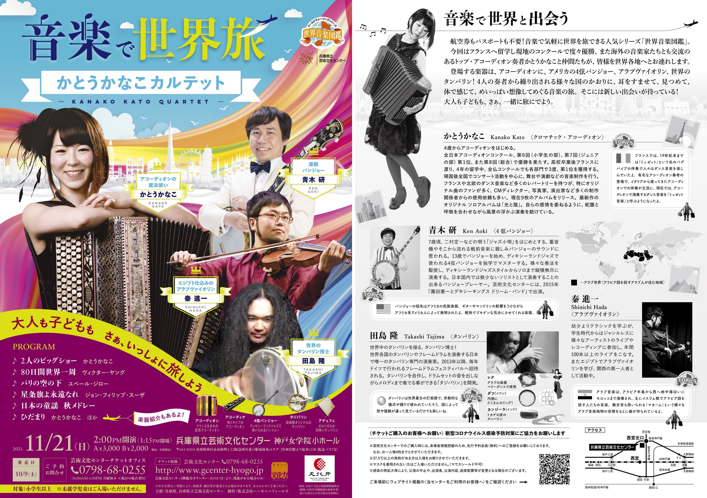 | 11/21 | 兵庫 兵庫県立芸術文化センター 神戸女学院小ホール「音楽で世界旅~かとうかなこカルテット」●かとうかなこ、田島隆、青木 研、秦 進一FLYER |