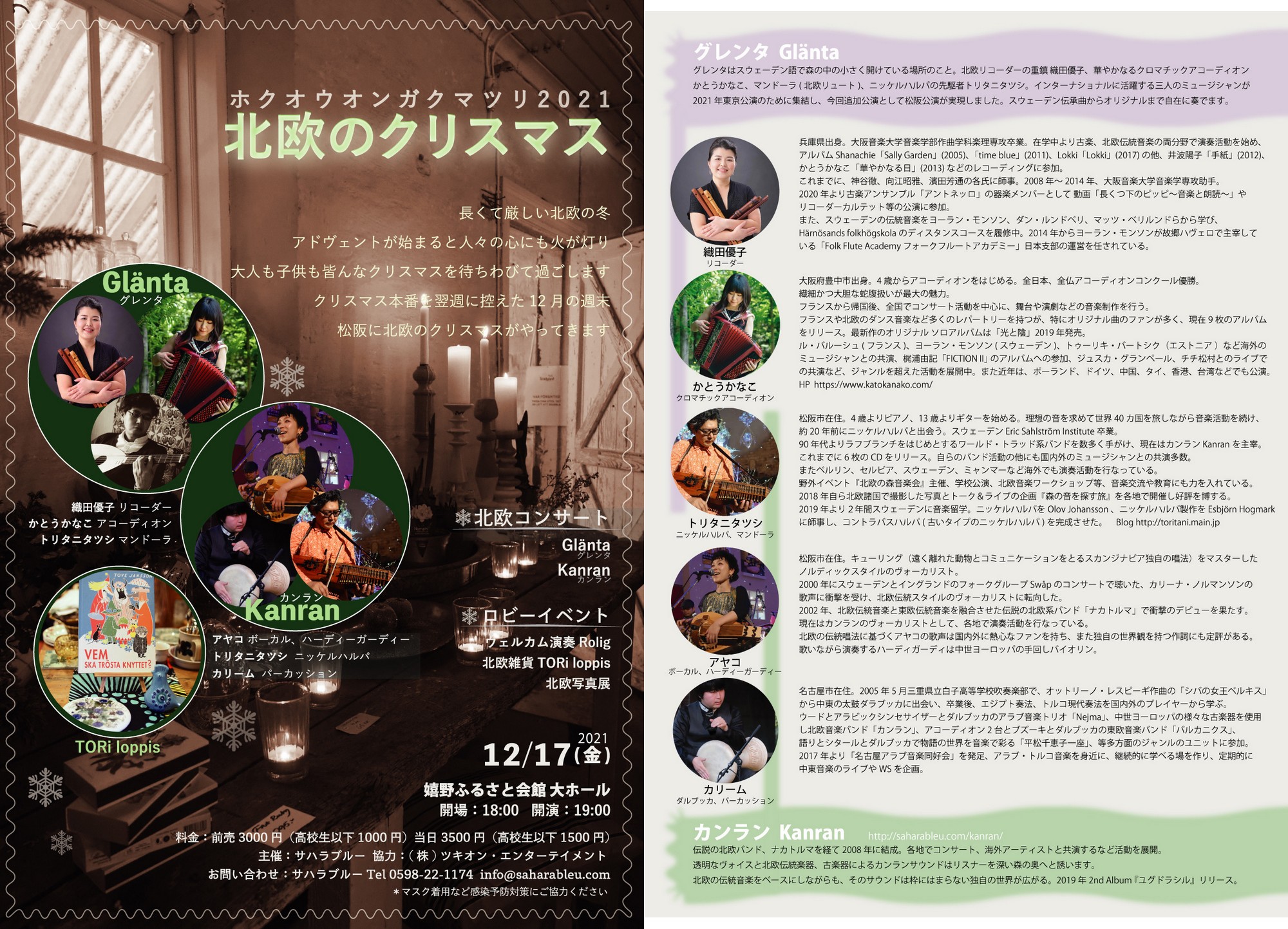 | 12/17 | 三重 嬉野ふるさと会館 大ホール「北欧のクリスマス」●アヤコ(ヴォーカル、ハーディガーディ)、織田優子(リコーダー)、かとうかなこ(アコーディオン)、トリタニタツシ(ニッケルハルパ、マンドーラ)、カリーム(ダルブッカ、パーカッション)FLYER |