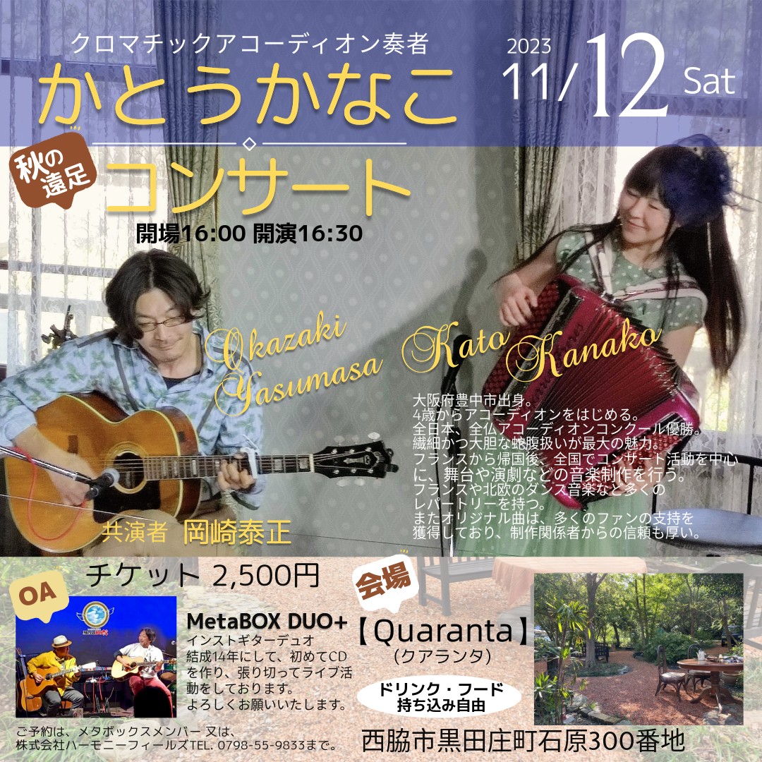| 11/12 | 西脇 Quaranta「秋の遠足コンサート」●かとうかなこ、岡崎泰正、MetaBOX DUO+FLYER |