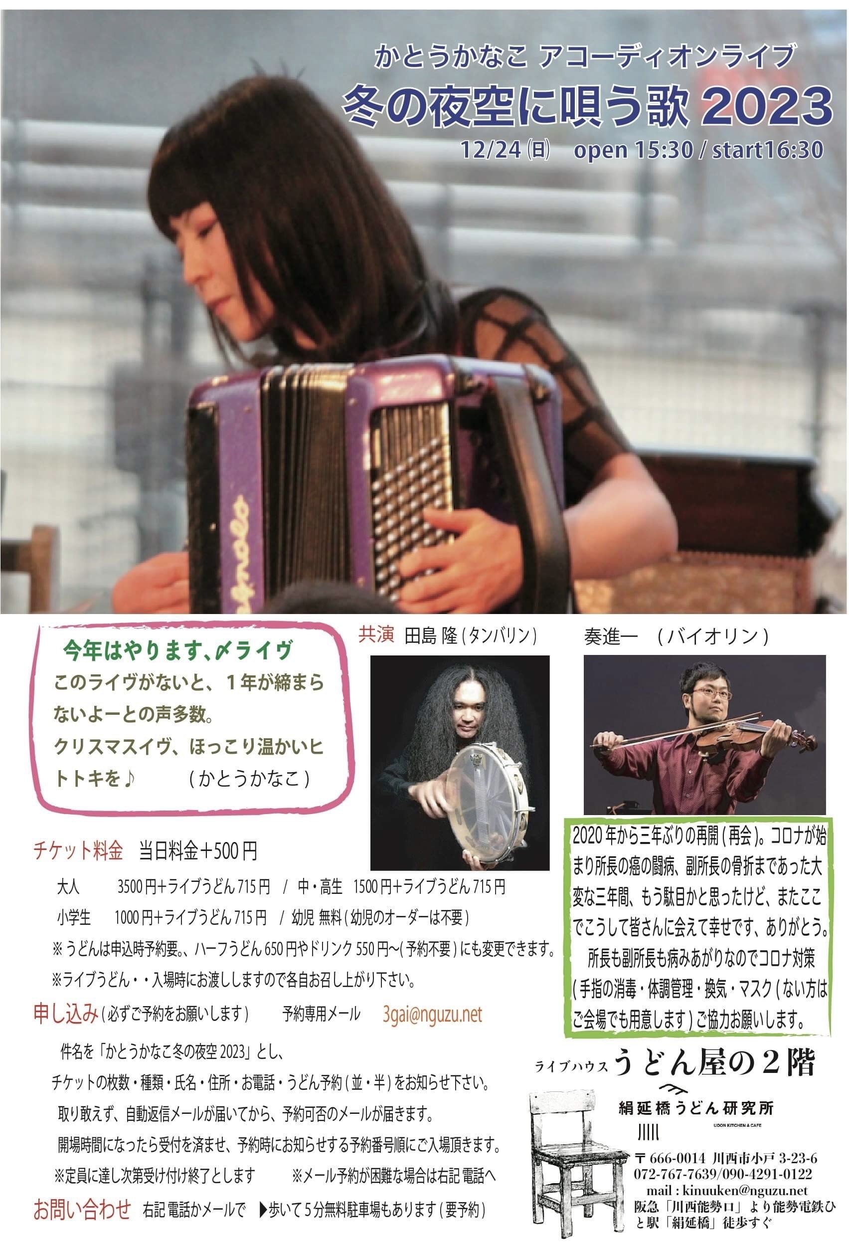 | 12/24 | 川西 うどん屋の2階「冬の夜空に唄う歌 2023」●かとうかなこ、田島隆、秦進一FLYER |